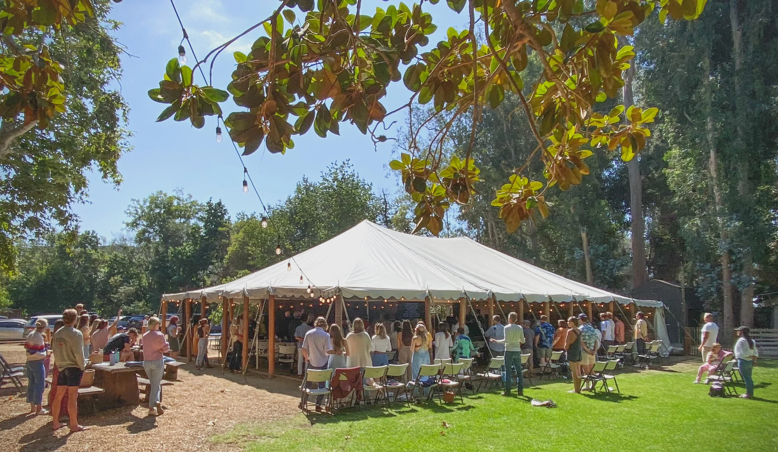 We are located off the PCH on Busch Dr., across the street from Inner Gardens. When you pull into the property, there is parking on either side of the driveway. If that area is full, continue following the driveway to the left of the tent. In the back, you will find a large eucalyptus grove with ample parking.